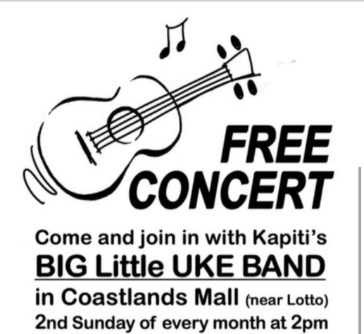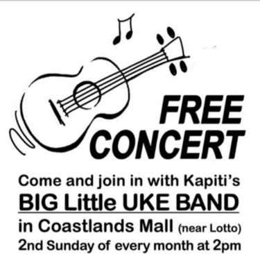 Join the community for a pre-show bite-and-coffee at Coastlands Mall on Sunday, 9 November from 12h30-ish ....... and then from 2 pm we can enjoy the free concert with Kapiti's BIG Little UKE BAND for a fun-filled Sunday afternoon !
